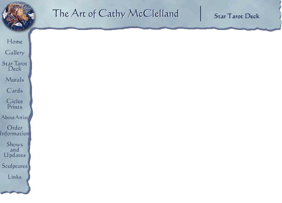 In 1991 Cathy decided to paint her own tarot images. She started with the majors, beginning with The Fool. These images would be part of 'The Star Tarot Deck', a name inspired by her love and fascination for the stars. Each image became a labor of love, taking up to three months to complete. In 1996 she finished the fifth image of The Emperor and took a long break. In the summer of 2005 Cathy decided to paint the rest of the majors, completing the 17 Keys in 2006. Then self published the majors only deck and booklet and in 2008. Which inspired her to move forward with the minors. The Star Majors only deck and booklet are sold out.